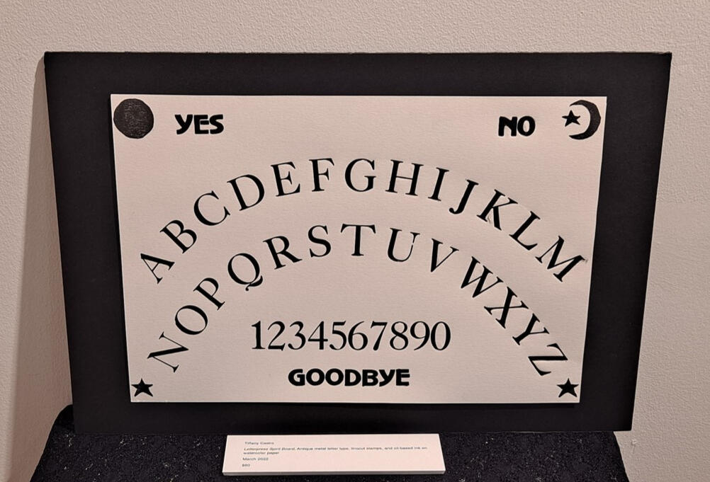 Letterpress Spirit Board, Antique metal letter type, linocut stamps, and oil-based ink on watercolor paper