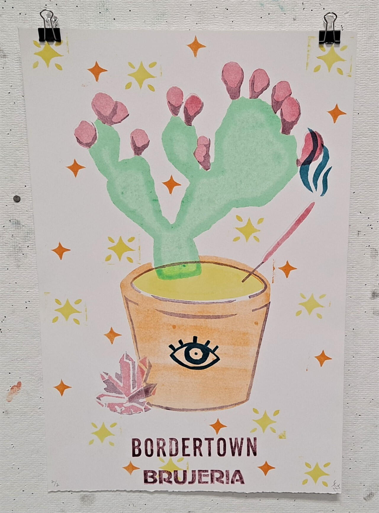 Bordertown Brujeria, paper stencils, acrylic-based ink, foam stamps, and letterpress on watercolor paper