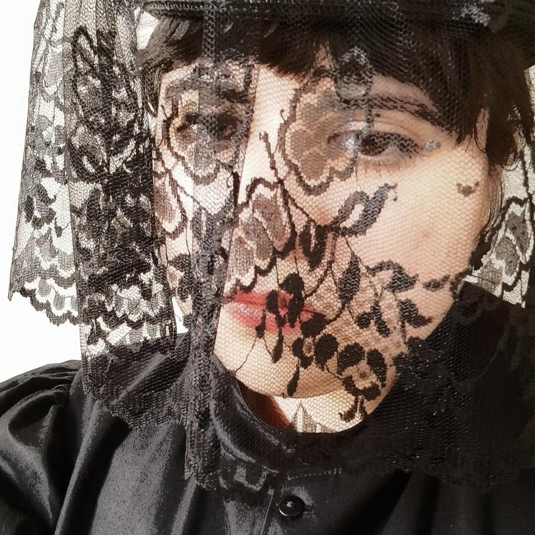Burial Shroud (in White), Silkscreen prints, acrylic-based ink, lace trim, perfume oil, felt, cardboard, ribbon, and antique Victorian era buttons on cotton. White crepe lilies created by my mother.